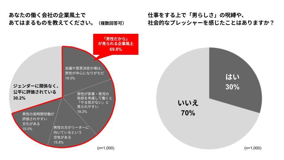 ウィルミナが全国1,000名の40~50代の男性会社員を対象に行った調査*では、約7割の人が、勤務する会社について「男性だから」の企業風土を感じていることが明らかになりました。そして3割の男性が、いまだに生活や仕事の場面で「男らしさ」の呪縛や社会的プレッシャーを感じたことがあると回答しています。