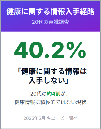 その一方で、特に若い世代に焦点を当ててみると、少し気になるデータがありました。健康に関する情報源を尋ねたところ、20代では約4割が「健康に関する情報は入手しない」と回答しました。これは30代でも約3割にのぼり、健康への意識はありながらも、必ずしも積極的に情報を探しにいくわけではない、という実態が浮かび上がってきました。