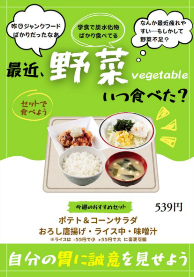 ポスターでは、サラダを組み込んだおすすめのセットメニュー提示によって選ぶ手間を省き、自然な形で野菜を手に取ってもらう「デフォルト効果」を狙いました。さらに、「最近、野菜いつ食べた?」という文言によって、思わず野菜が食べたくなる「クレンジング効果」も狙っています。