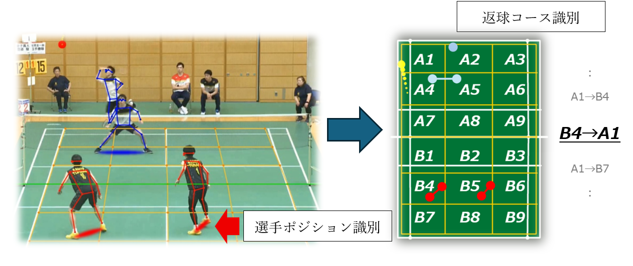 ■AI認識技術を活用した「選手ポジショニング、返球コース(エリア)」の自動識別によるデータ収集: