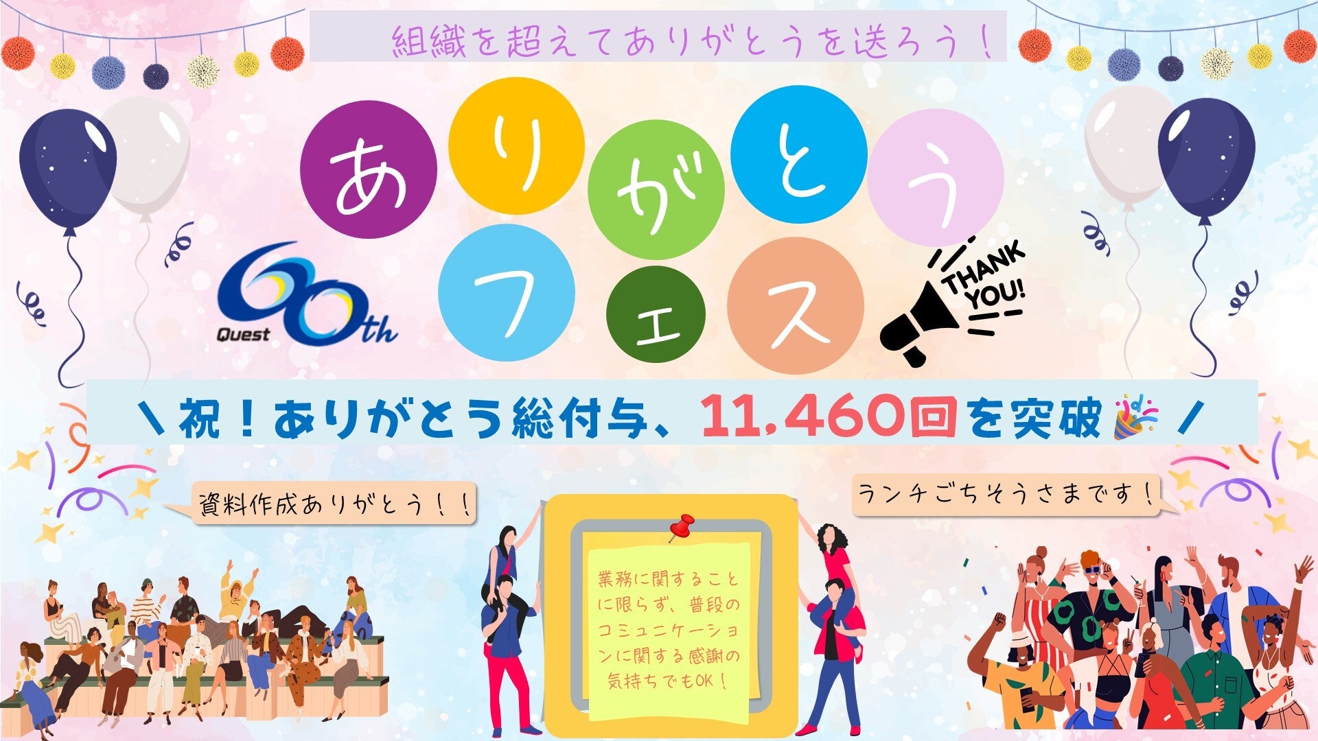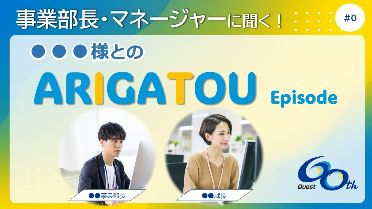 クエストは、今年創立60周年という節目を迎えました。「ARIGATOU~ITの未来はありがとうの中にある~」をスローガンに、社内イベントとして「お客様とのARIGATOUエピソード」「クエストちょっぴり自慢」「ありがとうフェス」を実施しました。