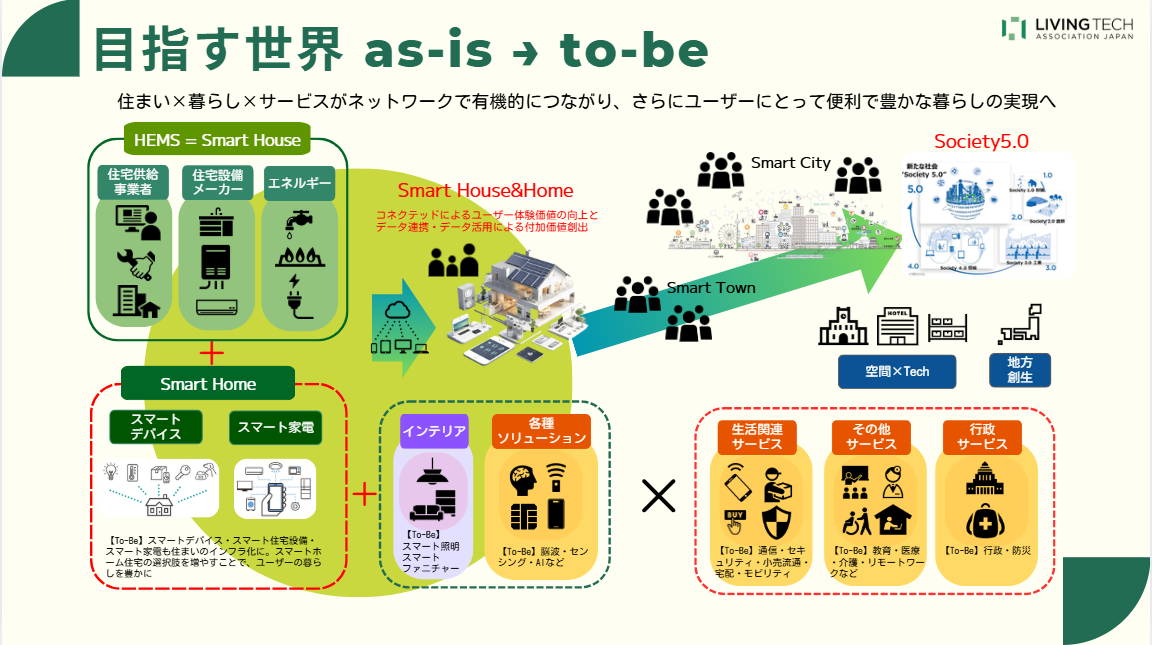 住宅・不動産領域においては、数年前までは分断されていたスマートハウス(HEMSなどのエネルギーマネジメントシステム)とサービス型のスマートホーム各社も連携していますし、国土交通省の取り組みで、IoT技術を活用した住宅向けの先導性のあるプロジェクトや、市場化(普及)に向けた取り組みに対する補助事業「次世代住宅プロジェクト」なども活用しながら、より多くの住宅関連事業者がスマートホームに取り組めるような仕組みを協会でも作っていきたいと考えています。