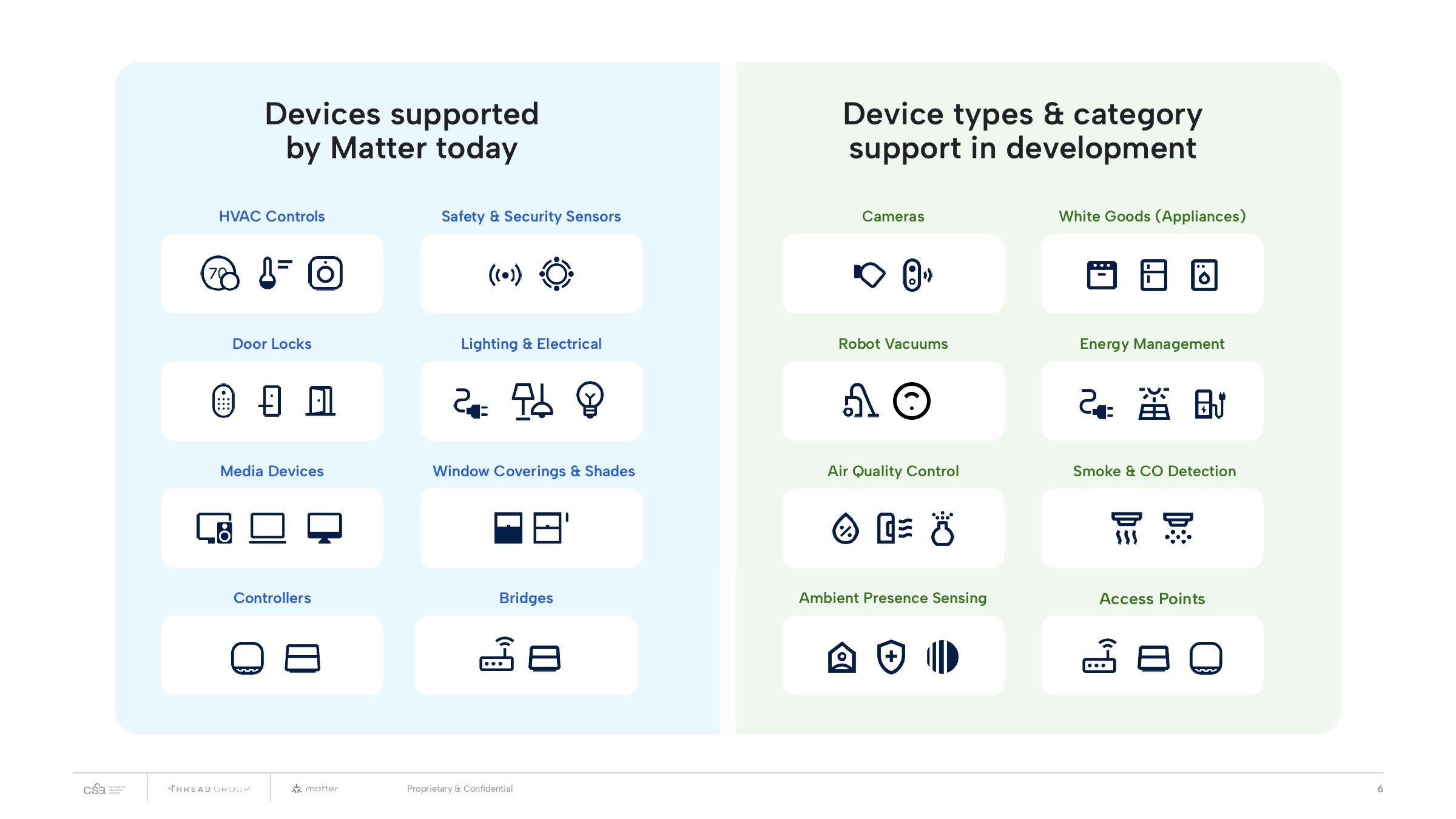 Chris:それについては私から回答しましょう。Matter 1.0は、ドアロック、サーモスタット、スマートプラグなど、従来型のスマートホームデバイスに焦点を当てていました。その後、ワーキンググループはスマートホームの定義を拡大し、ロボット掃除機や空気清浄機、キッチン関連や洗濯機などの家電製品などを追加しています。
