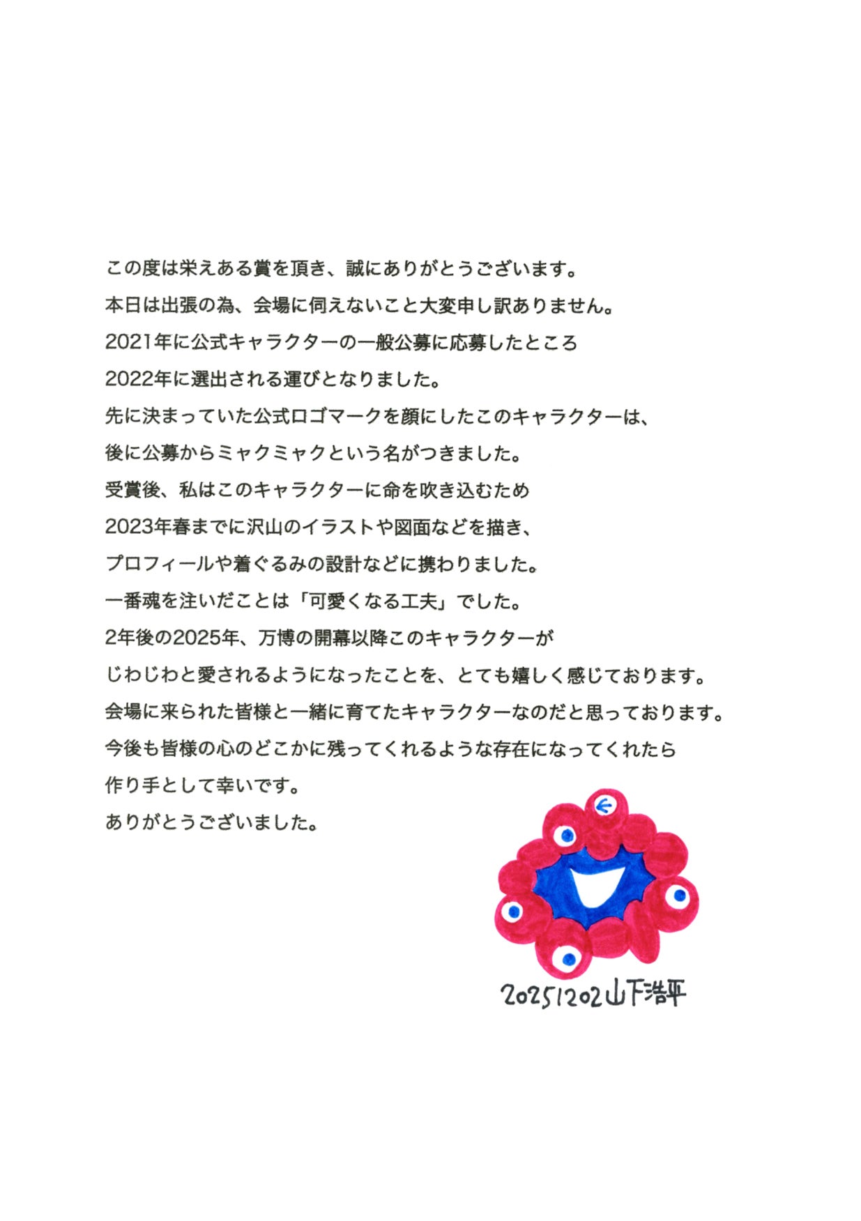 ご都合により欠席となった山下さんは手紙にて、「この度は栄えある賞を頂き、誠にありがとうございます。私はこのキャラクターに命を吹き込むため 沢山のイラストや図面などを描き、プロフィールや着ぐるみの設計などに携わりました。一番魂を注いだことは『可愛くなる工夫』でした。万博の開幕以降このキャラクターがじわじわと愛されるようになったことを、とても嬉しく感じております。会場に来られた皆様と一緒に育てたキャラクターなのだと思っております。今後も皆様の心のどこかに残ってくれるような存在になってくれたら作り手として幸いです」と喜びを表しました。