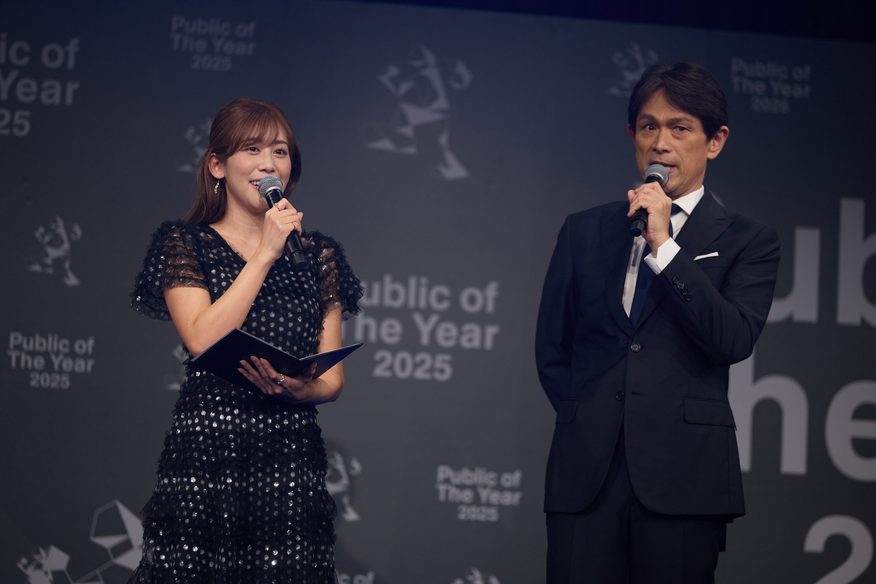 オープニングではメインMCの俳優・江口洋介さんと、司会進行の中川安奈さんが登場。江口さんは「授賞式のメインMCは初めてですが、社会を動かした1人の行動をたたえるという、この授賞式の趣旨をお聞きした際に、是非自分も関わりたいと思いました。社会をつなげた行動者に、会えるのを楽しみにしています」と、中川さんは「今年一年を振り返って、私自身も激動の一年だったのですが、幅広い分野でどんな方々が選ばれるのか、そして、皆さんの行動の源にはどんな想いがあったのか、お話を伺えるのを、今からとても楽しみにしています」と、それぞれが授賞式への思いを熱く語りました。 そして、中川さんから「Public of The Year 2025」の審査員を務めた10名の各界を代表するメディアや団体の方々が紹介がされました。審査員の皆様には、この後に続く表彰でプレゼンターを務めていただきました。![]()