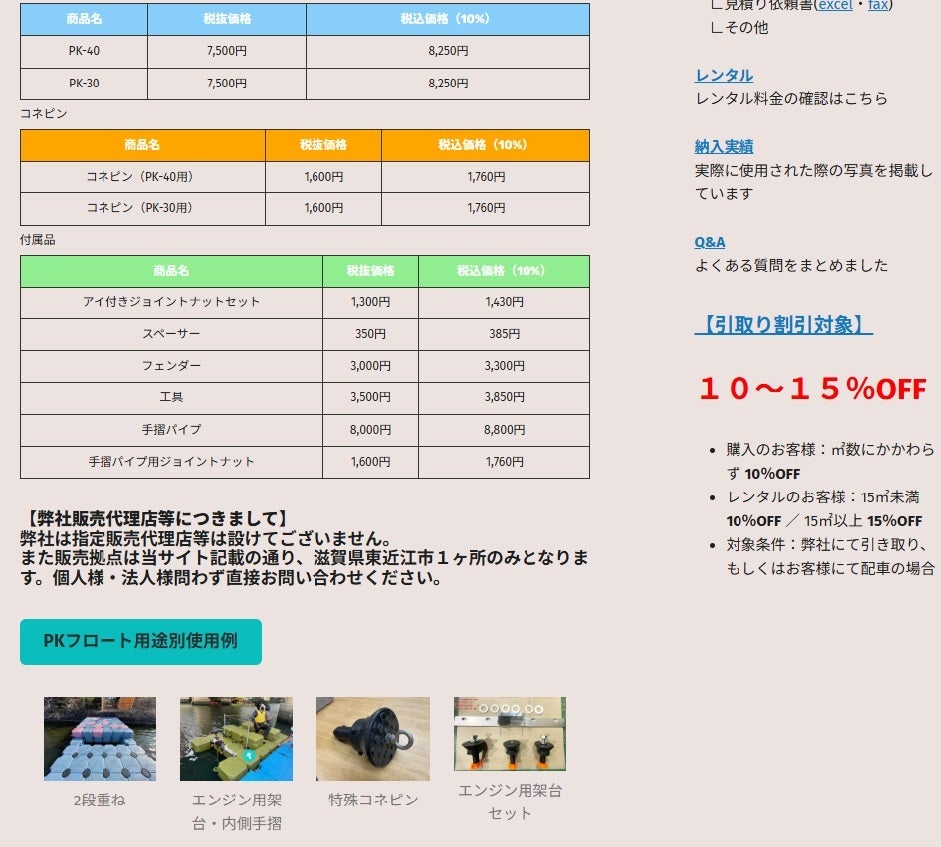 中でも、現在、自社製品としてシェアを伸ばしているのが、組立式浮桟橋「PK²フロート(ぷかぷかフロート)」。主に水上の足場として使用されており、販売とレンタルで全国展開に力を入れているところです。