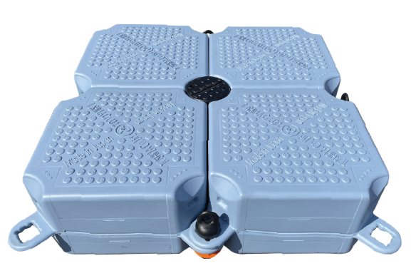 ●特許技術を駆使した業界初の凹みにくい「PK²(ぷかぷか)フロート」。運搬しやすく、組み合わせ自由、水上の工事からイベントまで幅広く対応