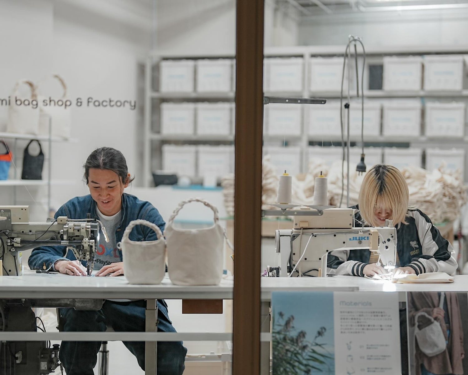 通り沿いの入口はガラス張りで、窓からは工房の様子がよく見えるようになっています。通り沿いに並んだ2台のミシンが置いてあることから、ご近所の方などが、様子を見に来たり声をかけてくださったりして、地域とのつながりも生まれています。
