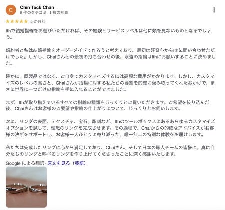 このようにただ指輪をつくるというだけなく、ithが培ってきた「アトリエと職人、そして顧客が一体となってつくりあげる特別な体験価値」は、ithがシンガポールでも選ばれる大きな理由になっています。