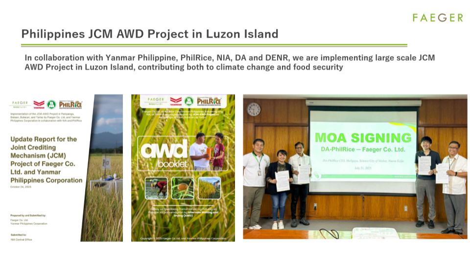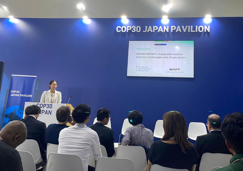 さらに会期中、農林水産省主催の「MIDORI∞INFINITY – Deploy GHG Emission Reduction Technologies with Private Sector」セミナーにて、フェイガーの取り組みも紹介されました。JCM(Joint Crediting Mechanism)を活用した間断灌漑(AWD)プロジェクトを中心に、現地の農家支援を通じた温室効果ガス削減と稲作の生産性向上ののアジア展開事例を共有しました。