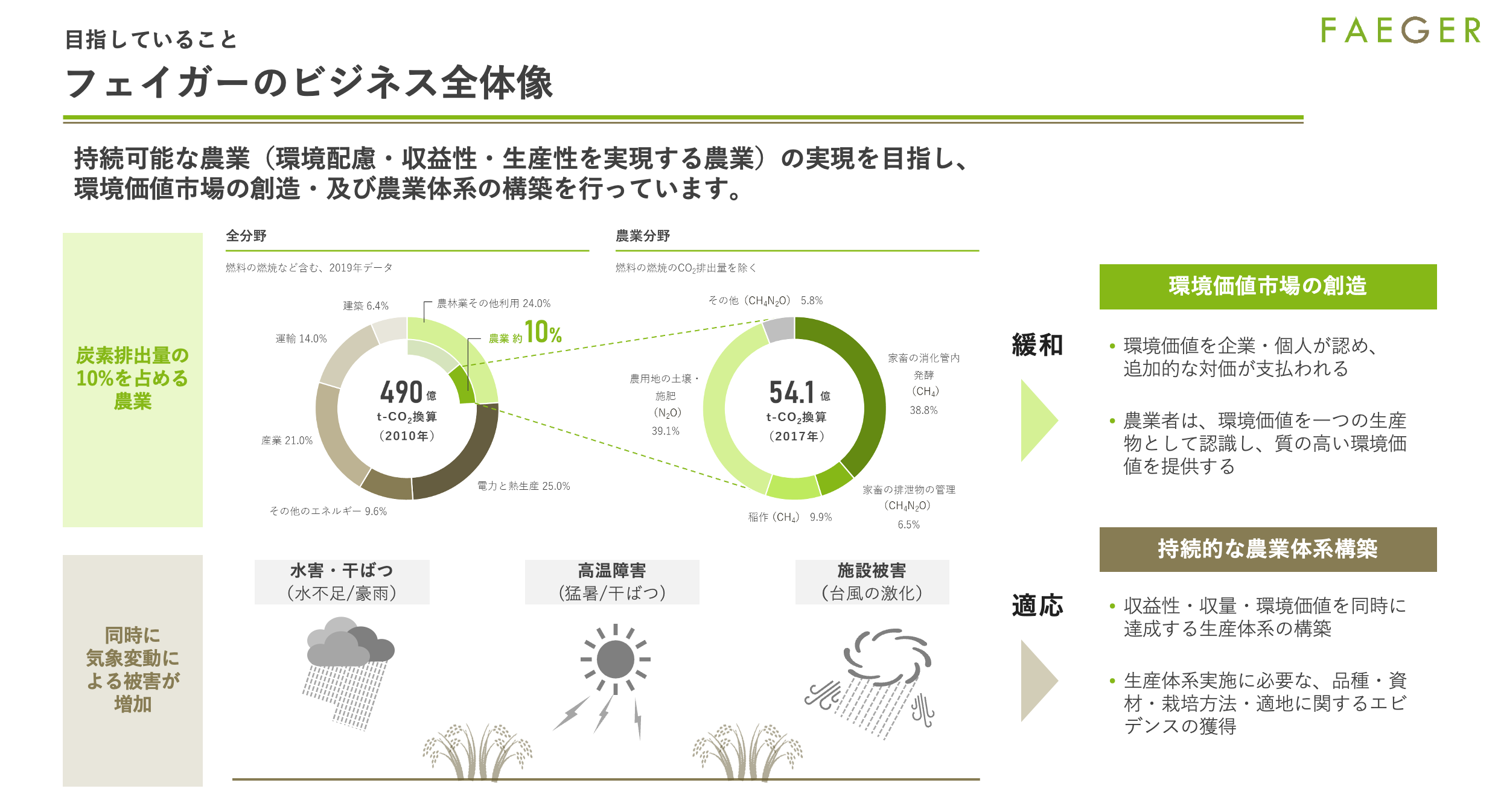 フェイガーは今後、農地を基点に 温室効果ガスの削減・除去(緩和) と 気候変動への適応 を、両輪としてさらに前進させていきます。