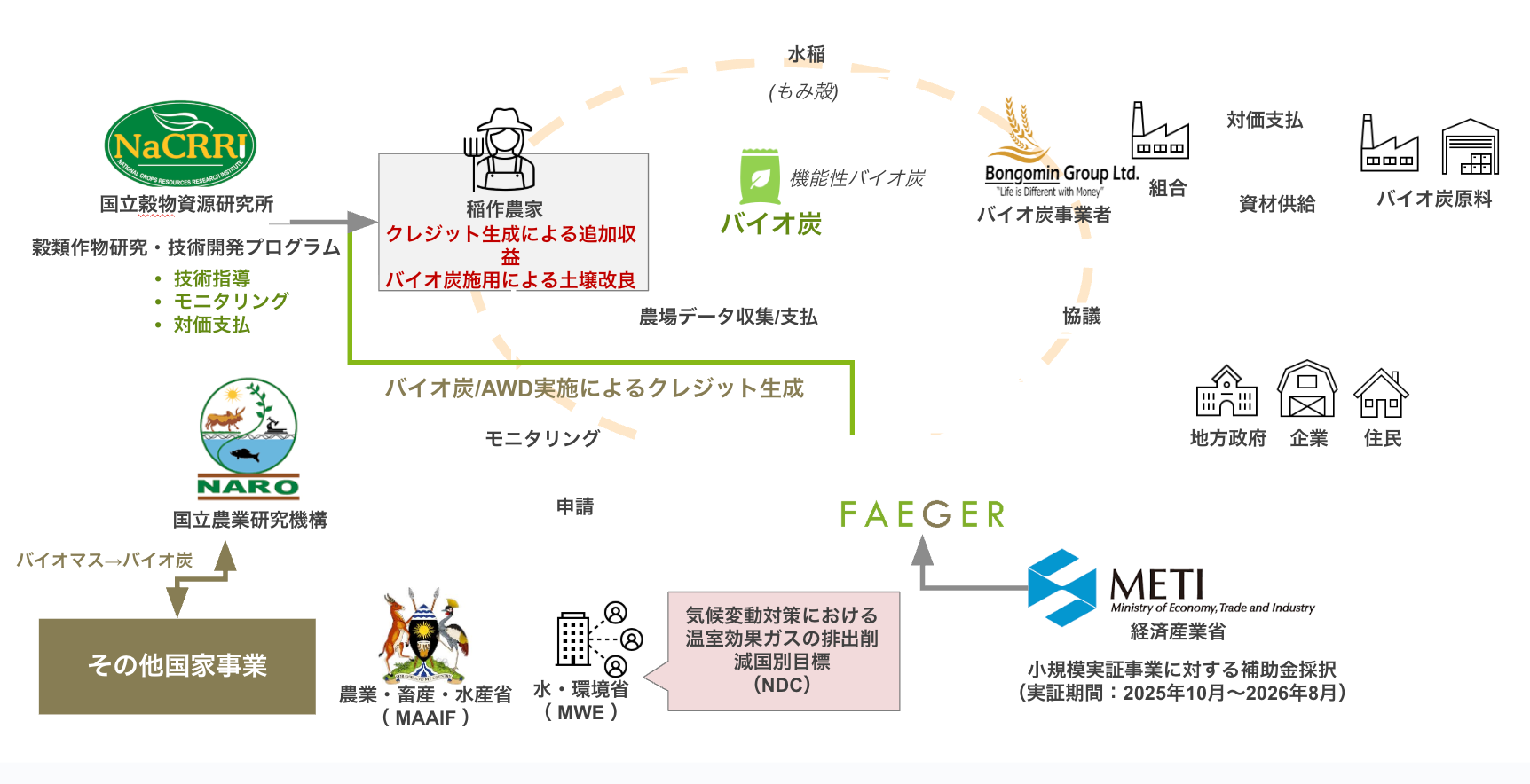 2025年10月、フェイガーは同国で「カーボンクレジットを活用した環境配慮型稲作の実証事業」を開始しました(経済産業省「グローバルサウス未来志向型共創等事業費補助金」に採択)。東部ムバレ県のドホ灌漑地区を対象に、バイオ炭施用とAWD(間断灌漑)による農業生産と温室効果ガス抑制の効果を定量化し、カーボンクレジットの創出を含めた事業性を検証します。アジアで培ったカーボンクレジット生成・販売の知見をアフリカの気候レジリエンス課題へ応用する取り組みであり、国立農業研究機構(NARO)や国立作物資源研究所(NaCRRI)と連携し、技術移転・人材育成も含む協働を進めています。2025年からはウガンダで農業系カーボンクレジットの法整備も進んでおり、フェイガーは現地のこうした動向を踏まえつつ、官民・南北連携による実装モデルの構築を、関係機関と協働しながら進めています。