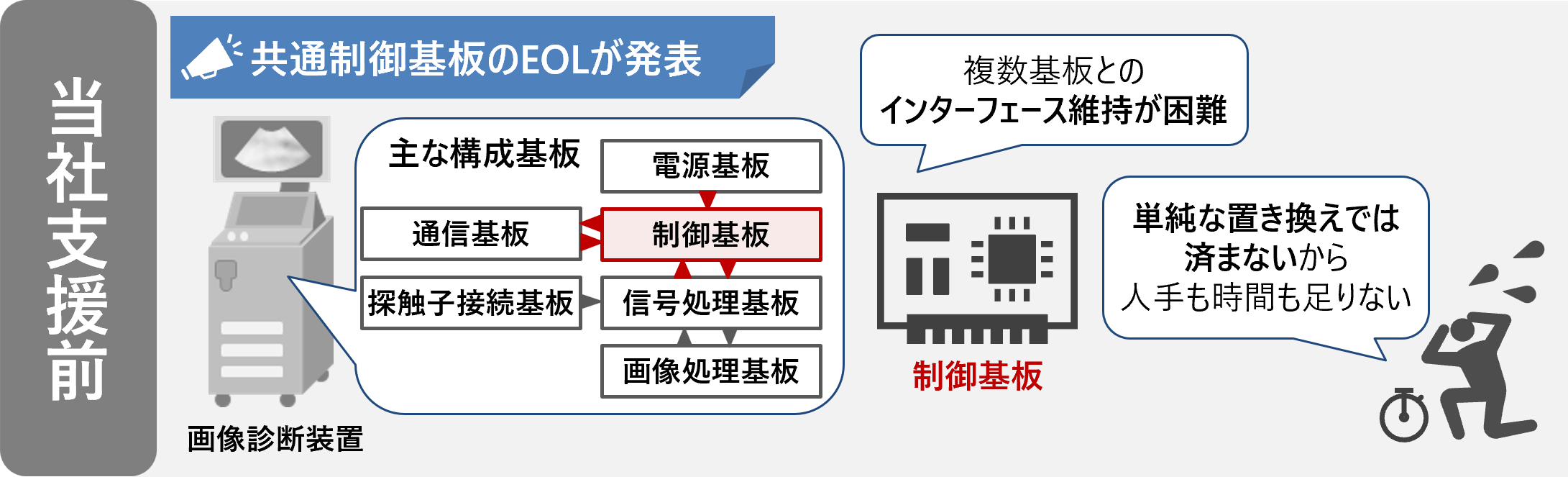 そこで今回は、医療装置製造メーカーのお客さまの事例を取り上げ、共通制御基板のEOLにより増大した開発負荷に対して、当社がどのような技術支援を提供したのかをご紹介します。