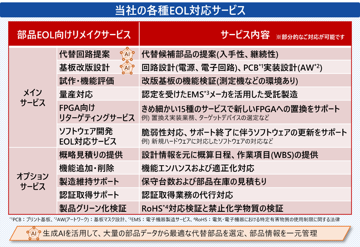 ハードウェアからソフトウェアまでワンストップでご支援する「部品EOL向けリメイクサービス」、ソフトウェアのEOLに特化した「ソフトウェア開発 EOL対応サービス」、FPGAの置換や継続利用に対応する「FPGA向けリターゲティングサービス」をご提供しています。それぞれに10~15のメニューがあり、お客さまの状況に合わせた最適なメニューをご提案いたします。