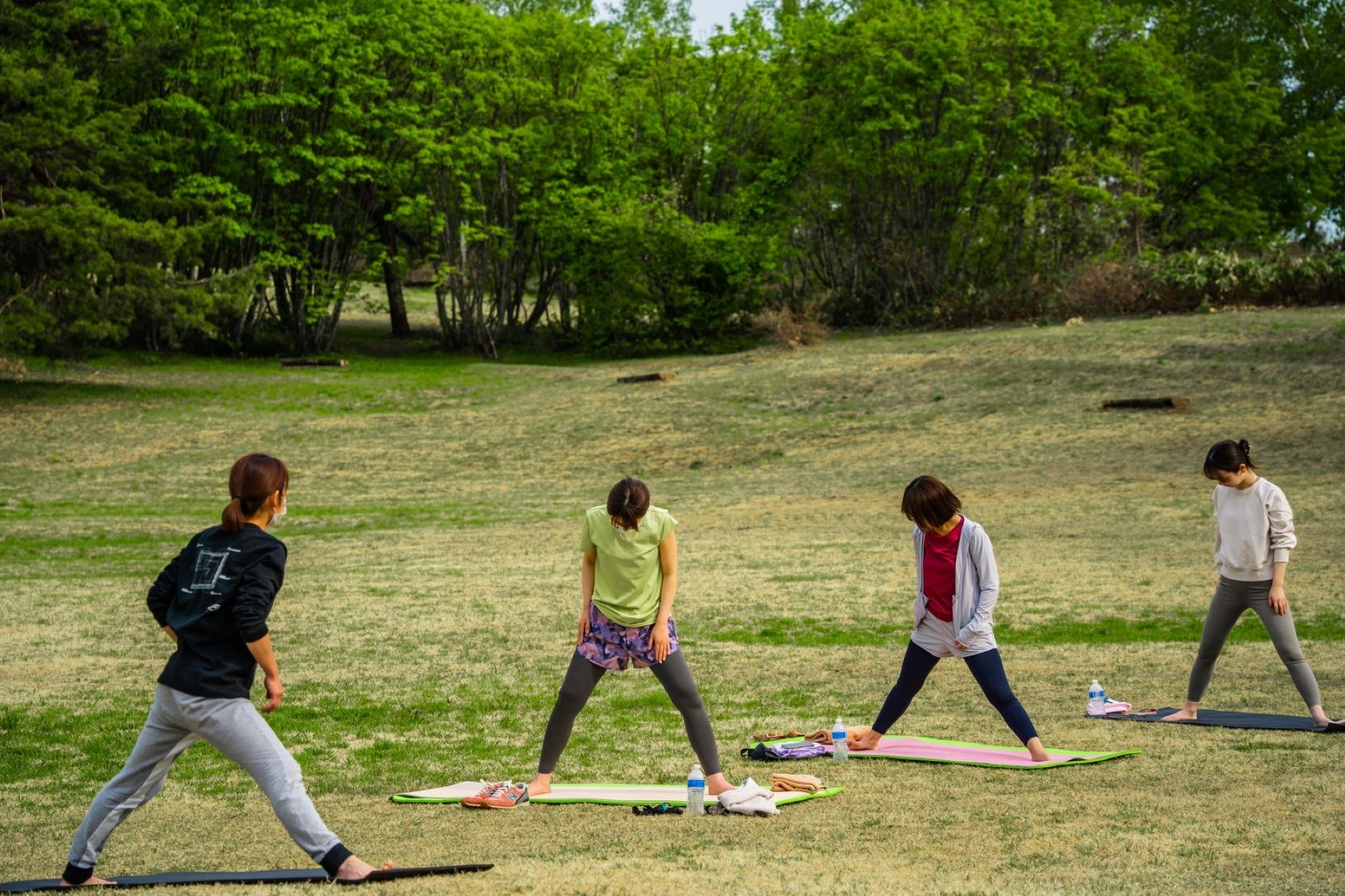 坊平の豊かな自然を活かしたセッション。焚き火や森ヨガで心身をリカバリー