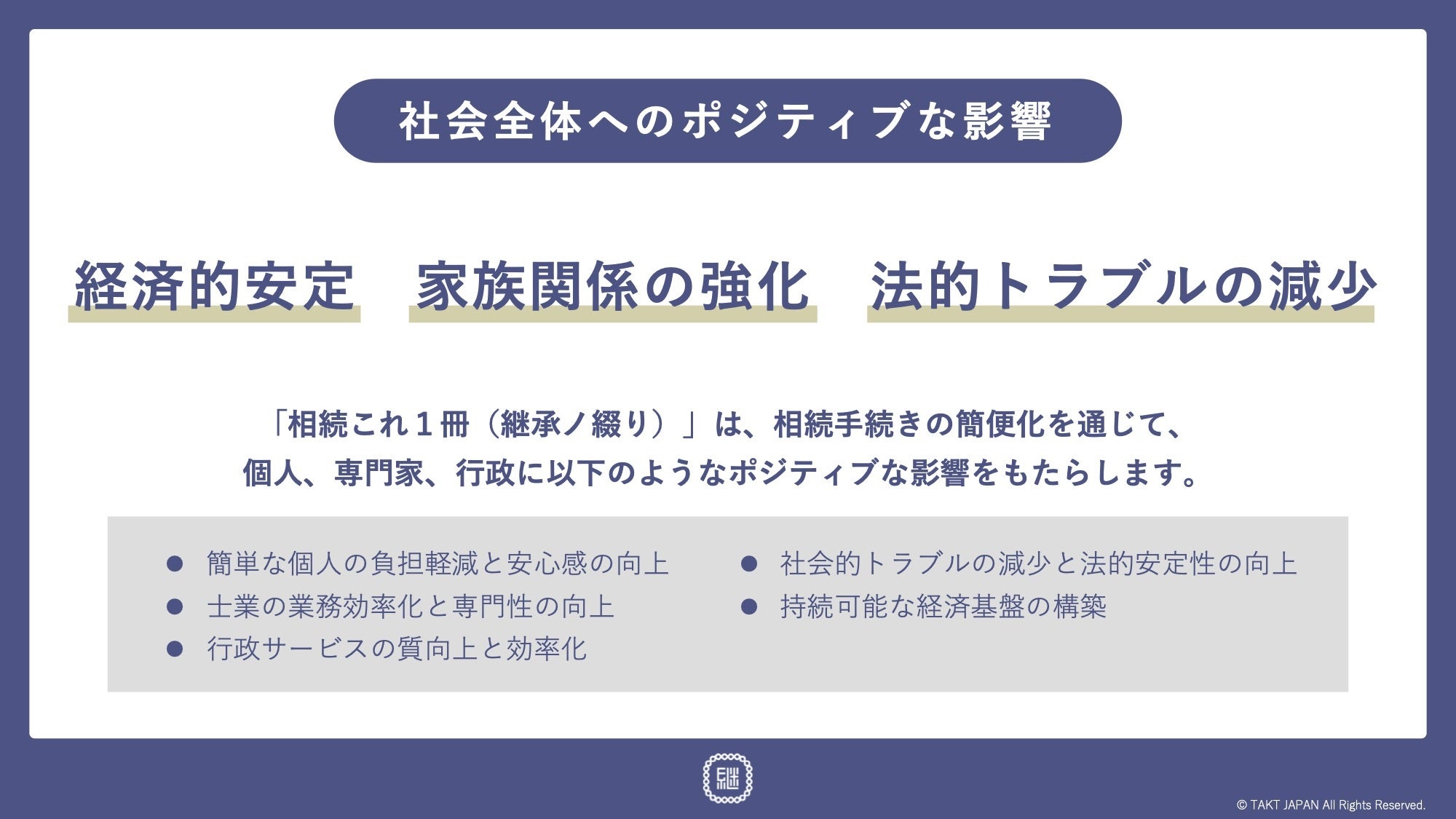 このサービスが提供するのは、単なる遺産相続手続きの簡素化だけではありません。「相続これ1冊(継承ノ綴り)」の目的は、相続の手続きにかかる負担を軽減し、日常をなるべく早く取り戻して心の余裕をもたらすことです。