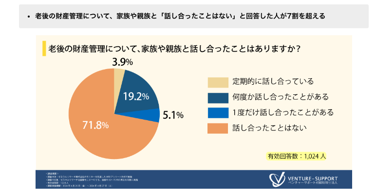 さらに、同じアンケートで、「老後の財産管理について、家族や親族と話し合ったことはありますか?」と質問したところ、7割を超える人が「話し合ったことはない」と回答しています。