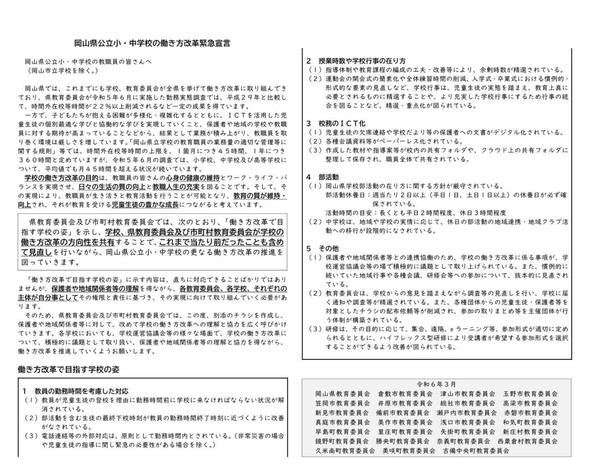 そこで、岡山県教育委員会と市町村教育委員会(岡山市を除く)は、働き方改革をさらに強力に進めます。令和6年3月に連名で出したのが「岡山県公立小・中学校の働き方改革緊急宣言」です。