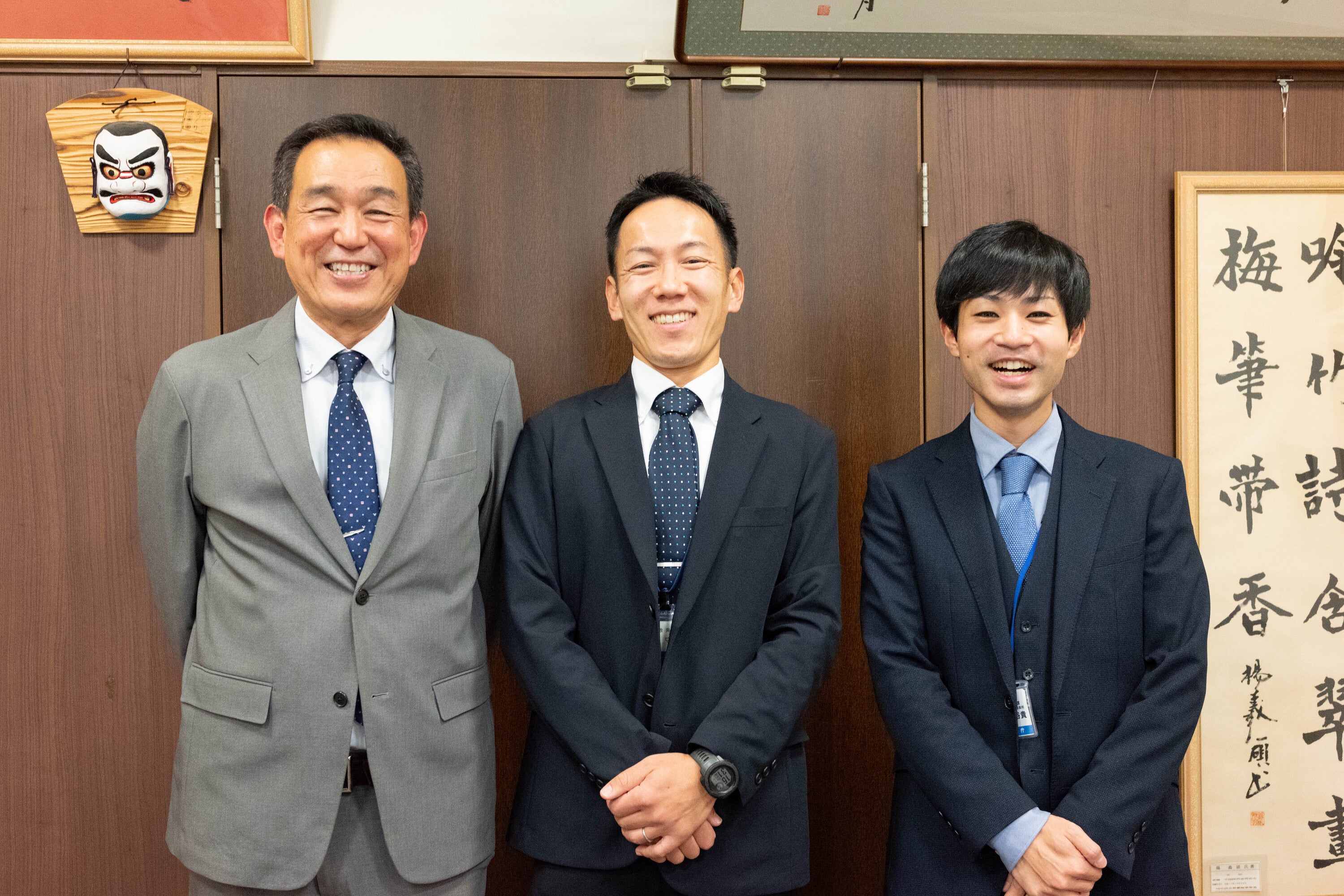 左:小野秀明校長 中央:岡山県教育委員会 守安諒平主任 右:同 新井裕貴主任