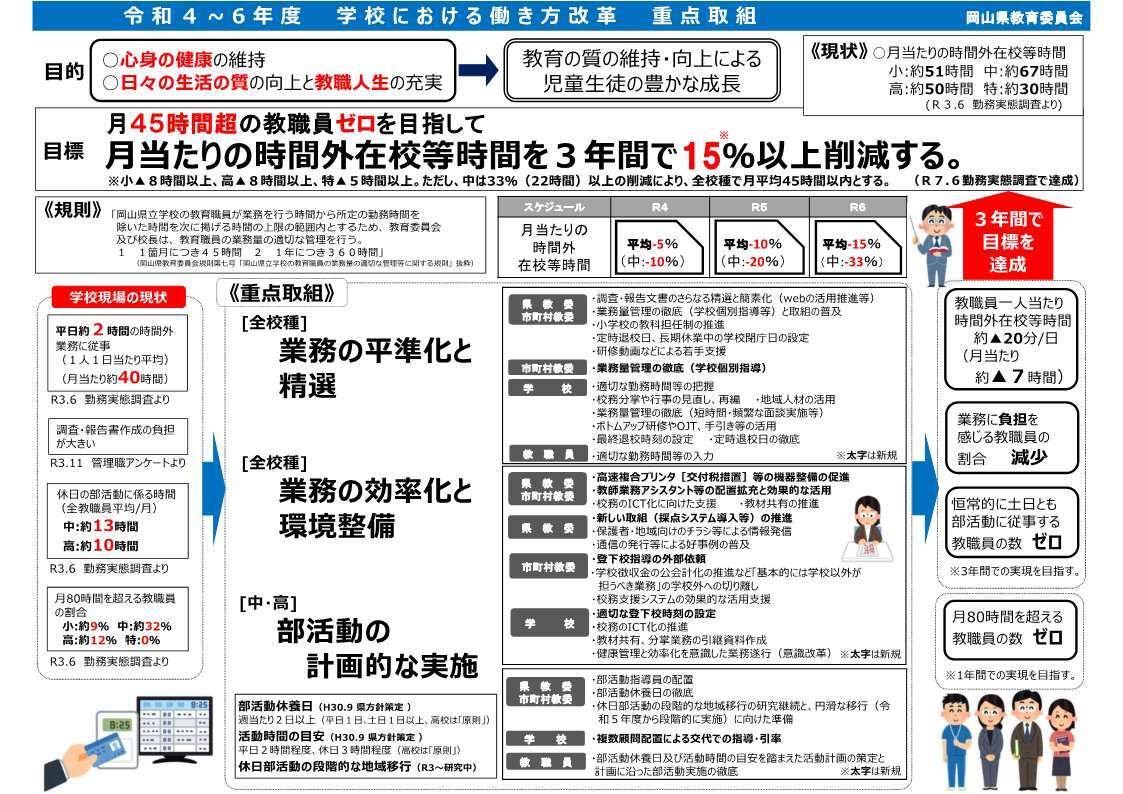 令和3年度末、岡山県教育委員会は「令和4〜6年度 学校における働き方改革 重点取組」を作成しました。
