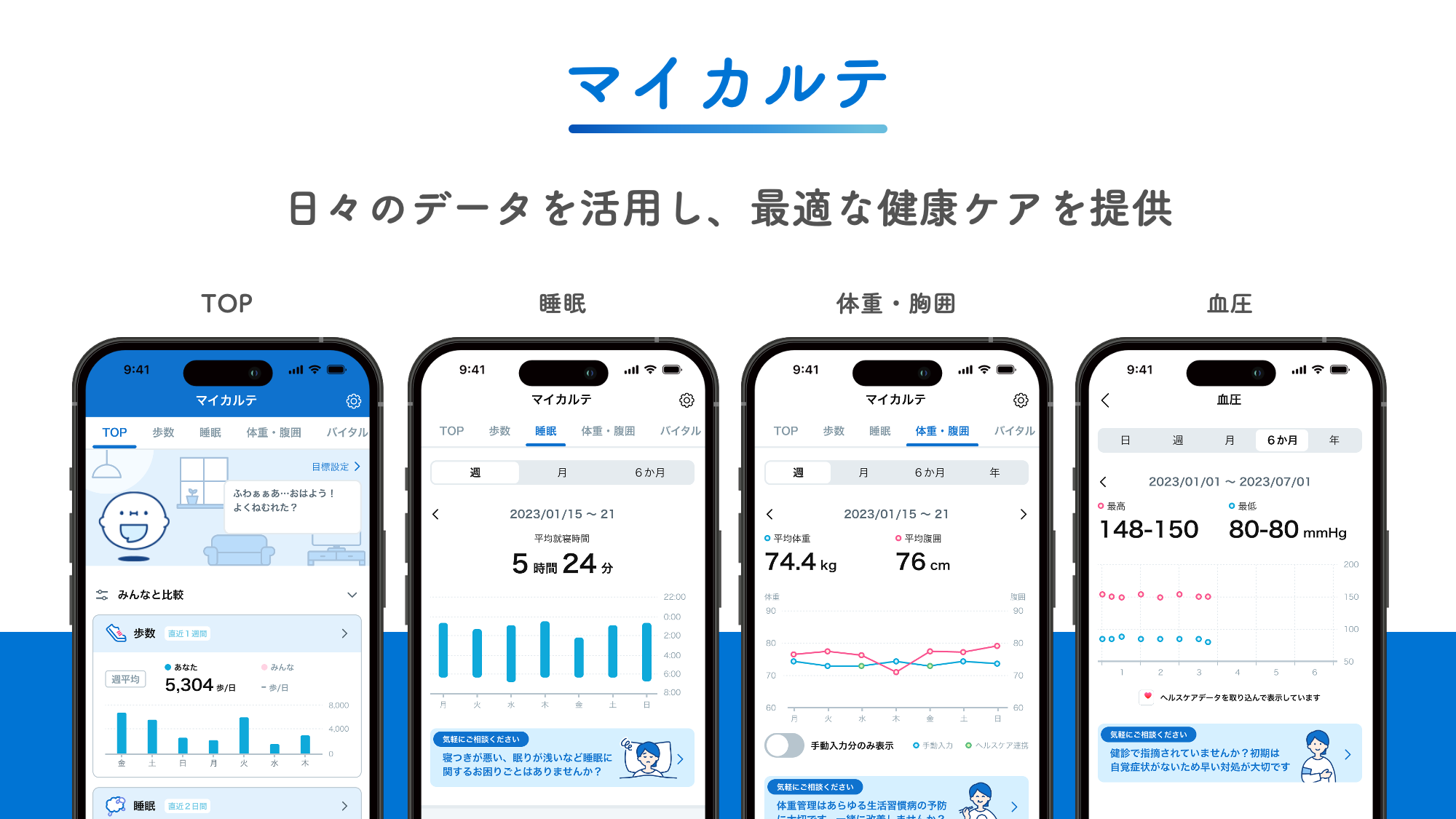 マイカルテという機能では、歩数や睡眠時間など日々の記録も可能なので、自分の健康状態を可視化することができます。