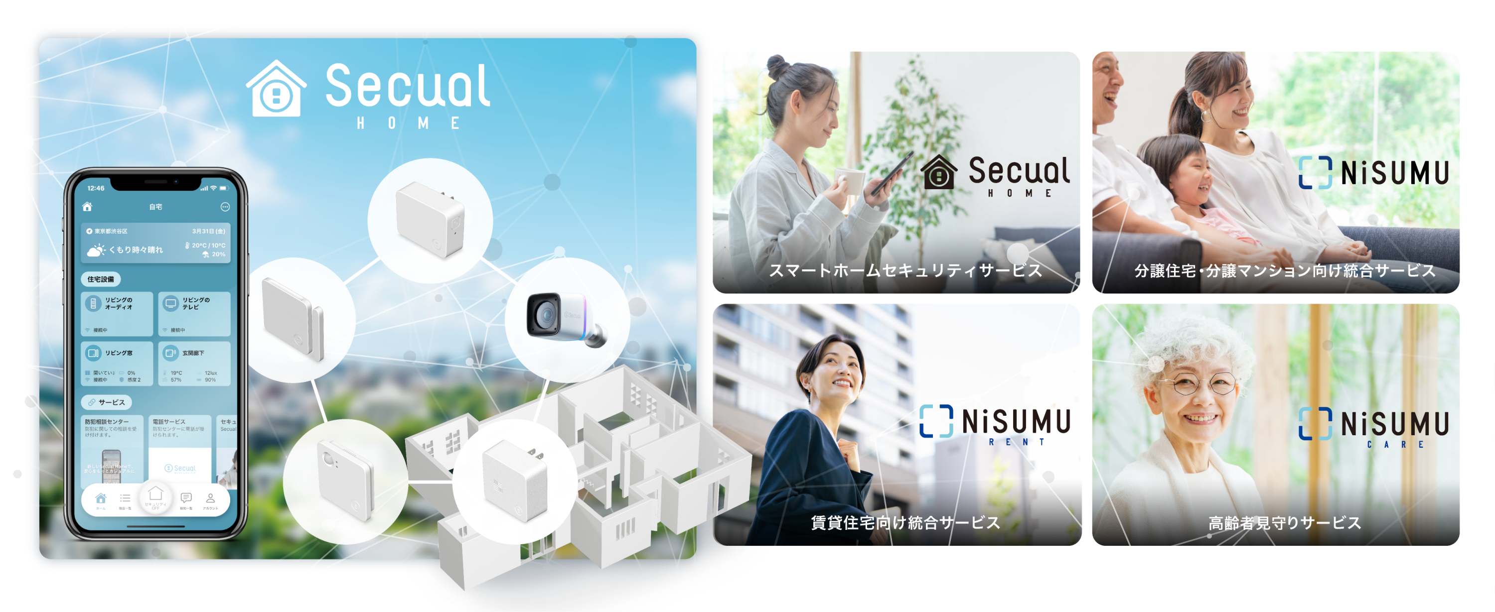 株式会社Secual は「ホームセキュリティを、もっと身近で誰もが気軽に利用できるものに変えたい。」という思いから2015 年に設立。個人向けのスマートホームセキュリティ製品『Secual Home』およびタウンセキュリティを目的とした防犯・防災・見守り機能を搭載した多機能なデジタル街路灯『Secual Smart Pole』の販売のほか、賃貸住宅に後付け導入が可能なスマートホームセキュリティとホームIoT サービス『NiSUMU RENT』、分譲住宅地にホームセキュリティ・タウンセキュリティ・コンシェルジュ機能を提供するスマートタウンの統合サービス『NiSUMU』、高齢者見守りサービス『NiSUMU CARE』を提供しています。「安心をもっとカジュアルに」をコンセプトに、セキュリティをリーズナブルに、スマートにご提供することで、安心感のある自分らしい暮らしが実現することを目指します。