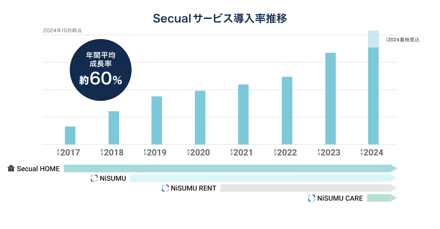 2025年で創立10周年を迎えるSecualは、『Secual Home』をリリースしてから現在まで、個人から企業、そしてまちへ続々と導入してまいりました。2015年のリリース当初と比較すると年間平均成長率は約60%にもなります。このようにスマートセキュリティサービスの普及は着実に進んでいます。