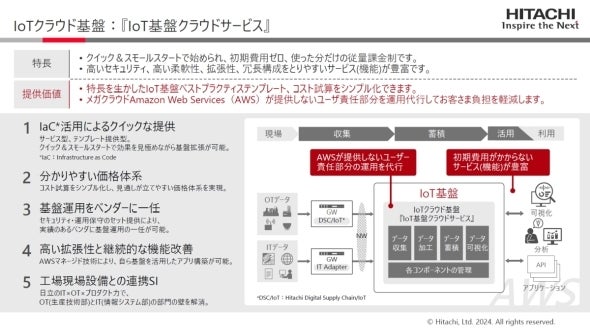 「使った分だけの従量課金制で利用できるのもメリットです。現時点でIPCSがサポートしているのはAWSですが、その豊富なサービスメニューを活用することで、IoT基盤に必要な機能を取りそろえたシステム環境をクイックに提供することが可能です。また、パブリッククラウドが提供しないユーザーの責任分界点となる部分を日立が運用代行することで、お客さまのシステム運用負担を軽減します」(井原氏)