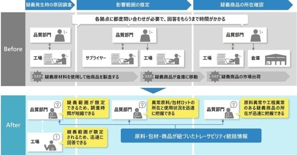「チェーントレーサビリティ」は、製品のサプライチェーン経歴をひも付けて管理し、品質異常を発見した際の調査対応を迅速化する。疑義原材料を使用した新たな作り込みや市場への流出リスクを軽減し、商品の安全/安心の追求、業務効率化の加速、サステナブルなサプライチェーンの実現、ロスコスト削減に貢献する。