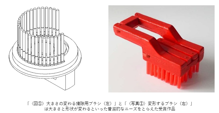 例えば、「必要に応じて大きさや形状が変わる」といったアイデアは、普遍的なニーズだと思います。令和2年度デザイン部門では「大きさの変わる掃除用ブラシ」〈図①〉が、同4年度パテント部門では「変形するブラシ」〈写真①〉がそれぞれ受賞しています。