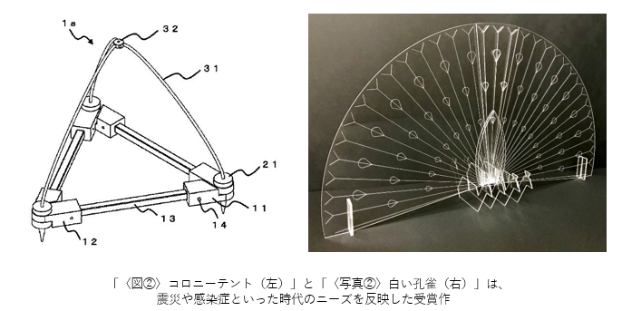 一方で、平成30年度パテント部門では、底面の形状が変えられるために被災地の貴重な空間を有効活用できる「コロニーテント」〈図②〉、令和3年度デザイン部門では、羽を広げた孔雀のように美しいアクリルパーテーション「白い孔雀」〈写真②〉がそれぞれ受賞。震災や感染症など、その時々の世相を反映した作品も数多く受賞しています。
