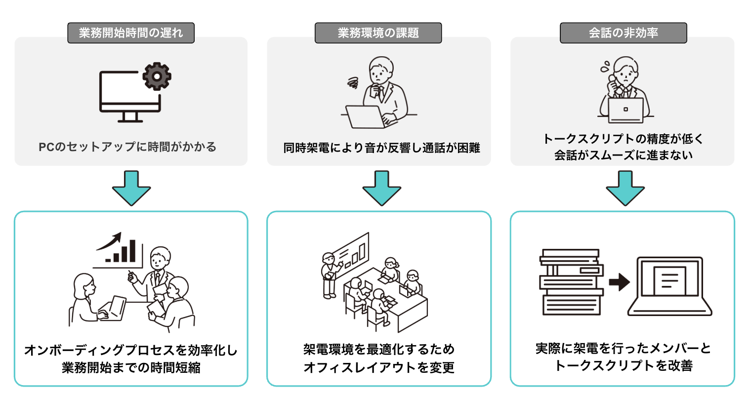 当初、全国規模での展開を目指すために10名体制のコールセンター部隊を立ち上げました。しかし、初日から多くの予期せぬ問題が続出。PCのセットアップが思うように進まず、業務開始に遅れが生じました。また同時に多数の架電が行われたことで、オフィス内の騒音による通話品質の低下、さらにトークスクリプトの不備によりスムーズな対話の妨げになっていました。