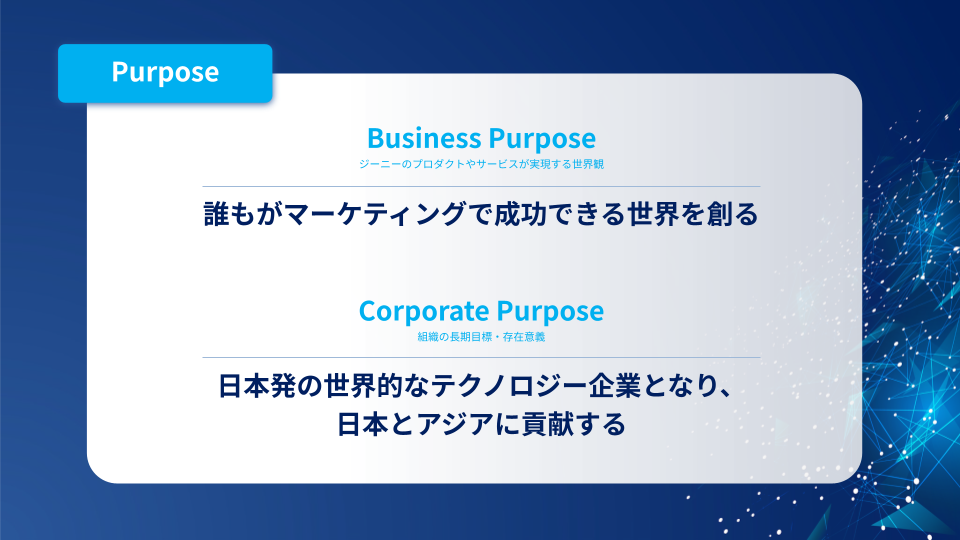 ジーニーは、「誰もがマーケティングで成功できる世界を創る」、「日本発の世界的なテクノロジー企業となり、日本とアジアに貢献する」という2つのPurpose(企業の存在意義)のもと、企業の収益拡大・生産性向上など様々な課題解決につながるソリューションを開発・提供するマーケティングテクノロジーカンパニーです。