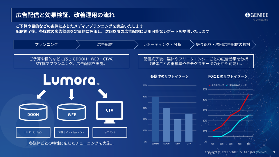「Lumora™」を通じて代理店や広告主様に新たなコミュニケーションデザインの価値を提供し、今後もブランディング領域においてジーニーが確固たるイメージを築き上げられるよう新たな挑戦をしていきます。