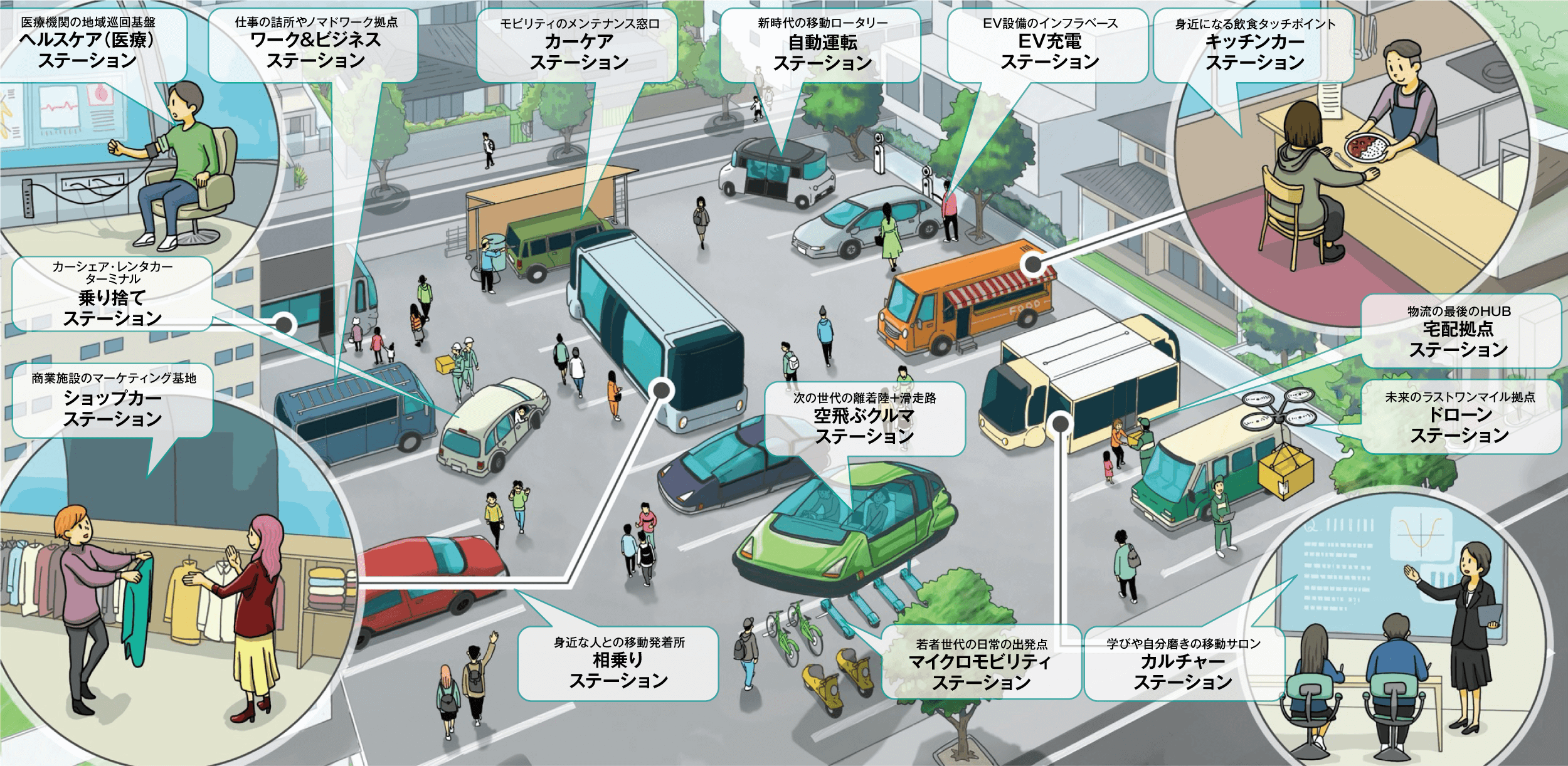 増田:真鍋さんがおっしゃるように移動は手段ですが、多様化していますよね。小型モビリティもそうですが、カーシェアリングやライドシェア、将来的には自動運転なども実用化されると思います。ただ、クルマである以上、「発着所」という存在は欠かせません。さまざまなモビリティのハブとなることで、地域の皆さんの豊かな暮らしに貢献できるんじゃないかと思っています。ですので、自宅の近くの「小さな駅」になれたらという想いで「ステーション」と呼んでいます。ちなみに、構想図にはドローンの発着所も入れているのですが、真鍋さんはドローンのスタートアップにご出資されていますよね?