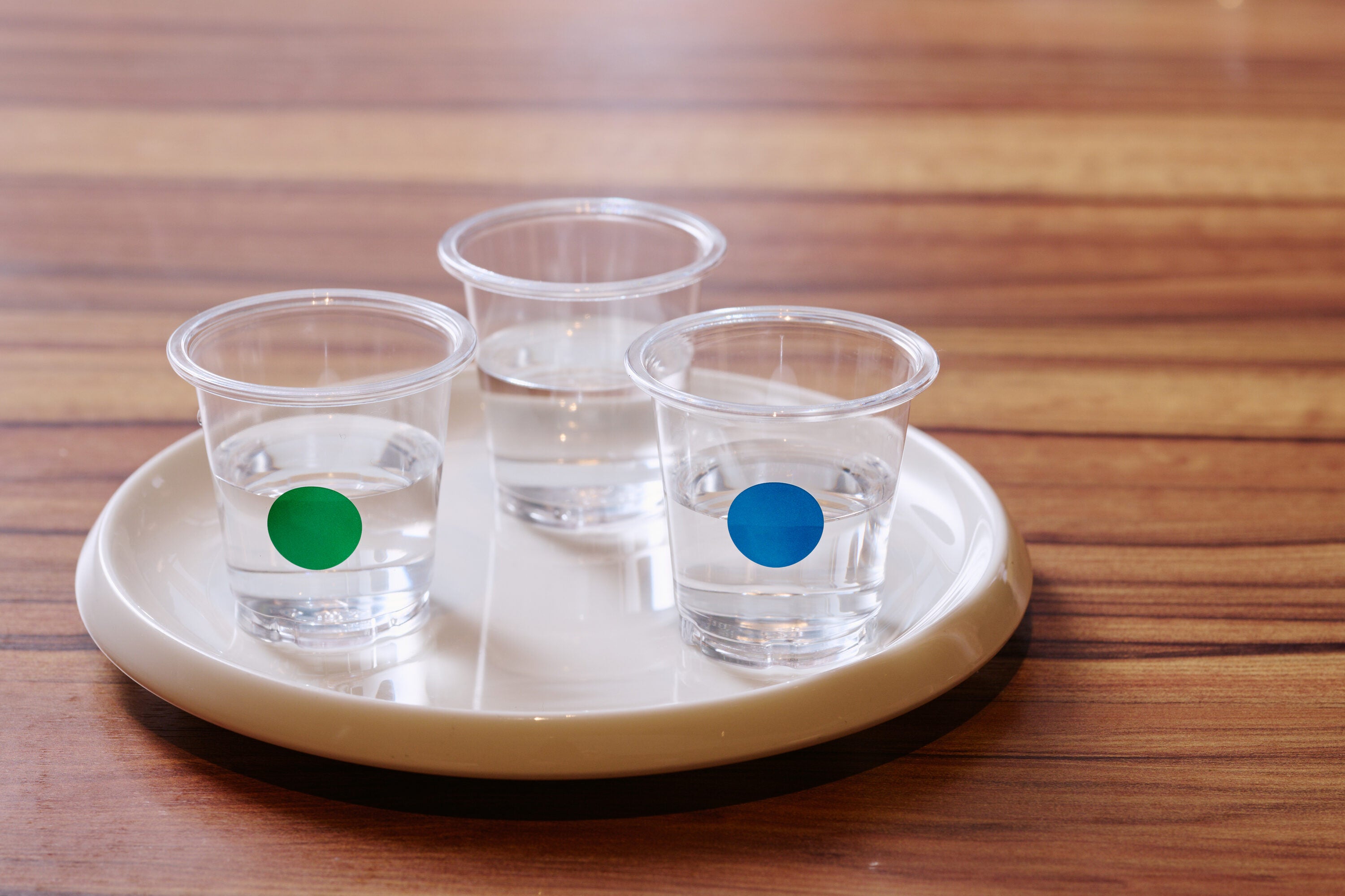 まずは、ミネラル in ウォーターと浄水との飲み比べです。浄水(シールなし)、常温のミネラル in ウォーター(緑のシール)、冷たいミネラル in ウォーター(青のシール)を、順番に味わい、その違いを体感いただきました。