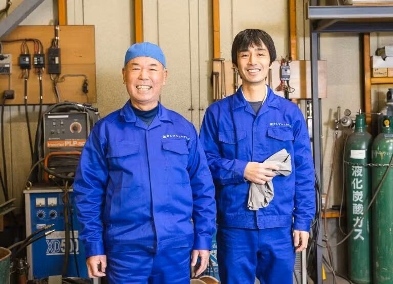 <『カシマウェルディング』代表・茨木堅さん(左)、工場長で長男の真平さん(右)>