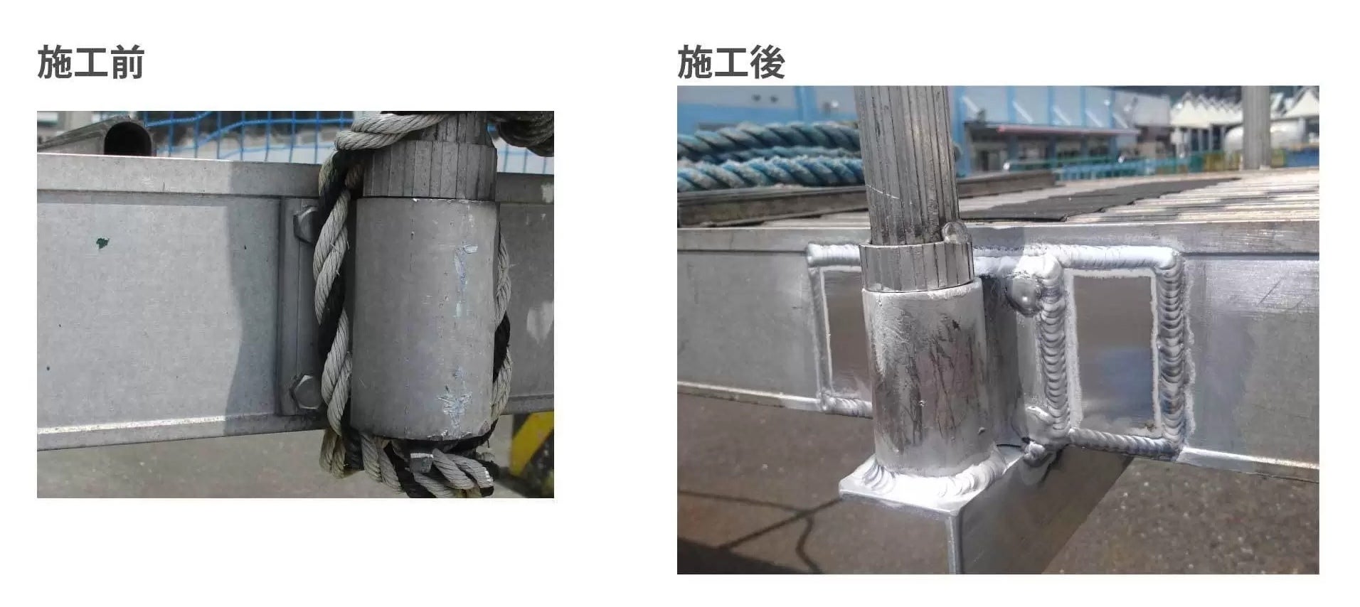 緩んでしまっている為、本体に補強プレートと手摺を溶接し固定しました。>