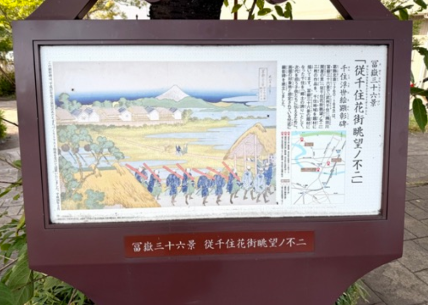 また、江戸時代に葛飾北斎が描いた「富嶽三十六景」で、千住を題材にした作品が3点あり、足立区内のその縁の地に「NPO法人千住文化普及会」が顕彰碑を設置する際には、その製作を「カシマウェルディング」が請け負いました。