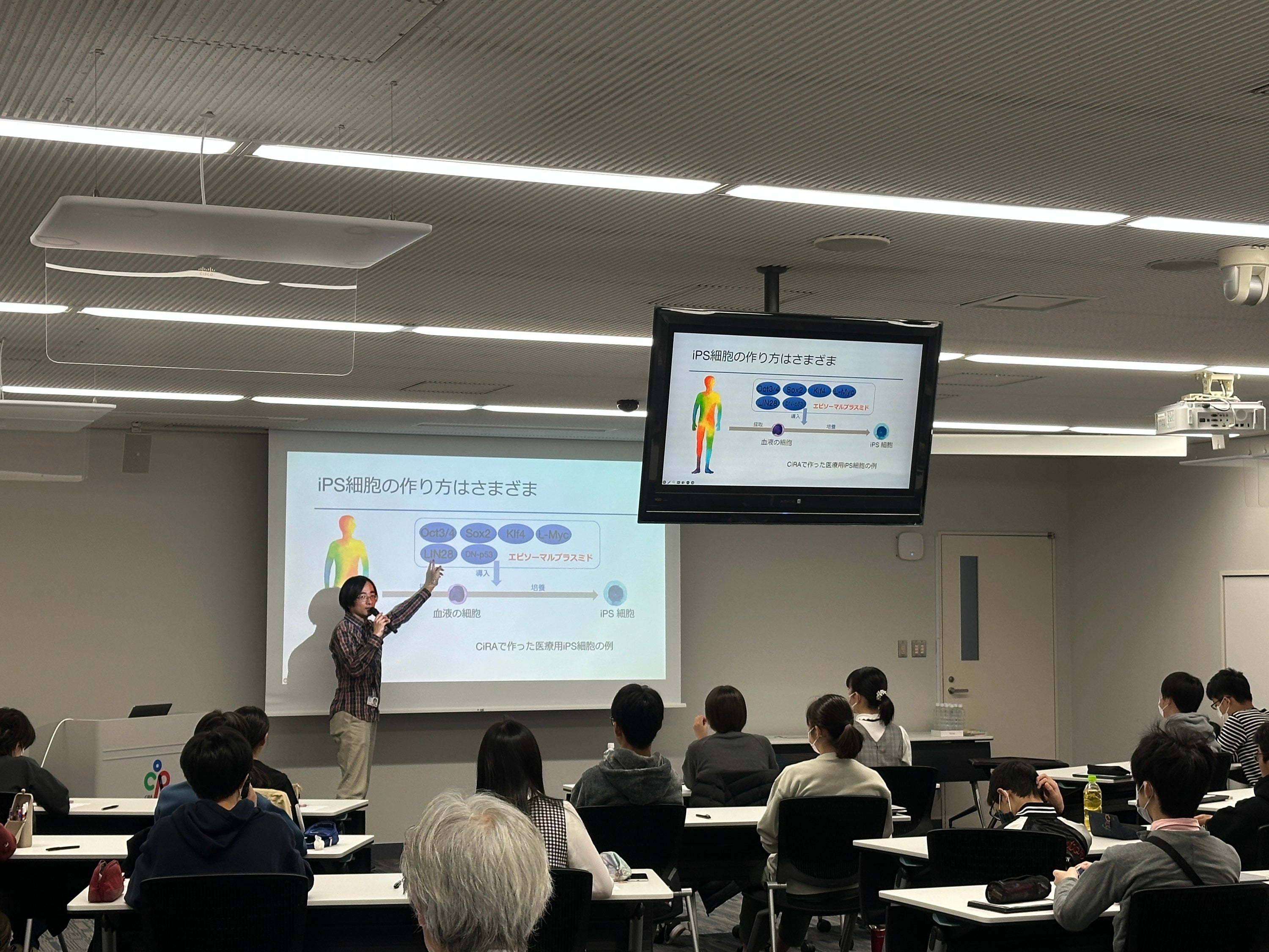 iPS細胞研究所のサイエンスコミュニケーター和田濵 裕之氏の基調講演「”iPS細胞”を知る」では、iPS細胞の基本的な知識から未来へ向けた目標まで専門的な用語も交えた内容でしたが、受講生はメモを取りながら興味深く聞く様子が見られました。