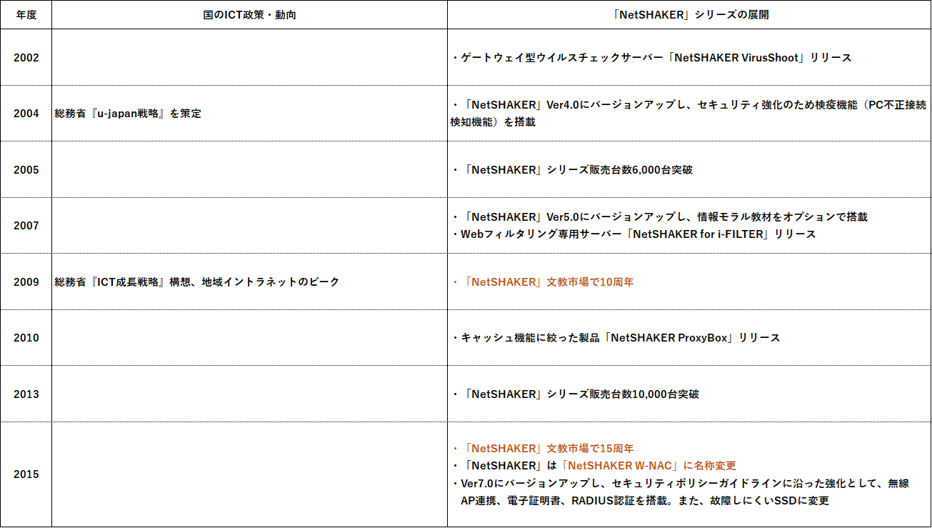 教育現場ではインターネットの知識が不足している状況もあり、インターネットサーバーとして「NetSHAKER」は依然として需要がありました。2015年には、「NetSHAKER」はVer7.0にバージョンアップし、セキュリティ装置としての進化を遂げ、名称も「NetSHAKER W-NAC」へ変更されました。