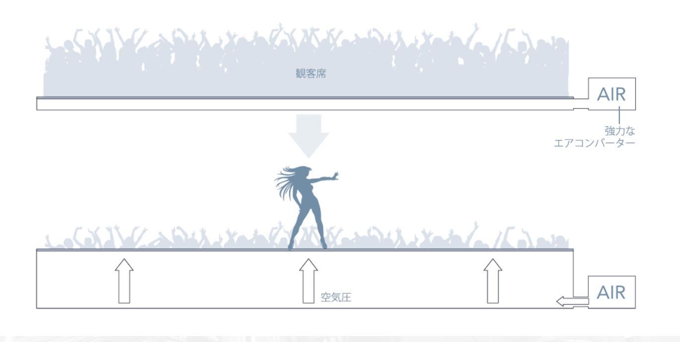 度管理をしています。また、演出のひとつでもありますが、普段は平面になっていて避難口の導線を確保しながら、アーティストが登場するタイミングに合わせて出現させる花道『エアデッキ』は、安全面と演出面を兼ね備えた画期的な技術だと思います。もはや演出というより舞台機構といえるでしょう。」