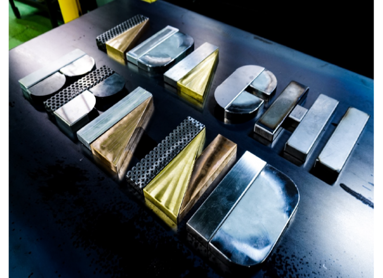 「厚みの違う銅やアルミ、ステンレス、真鍮、鉄など様々な金属を溶接や曲げなどしてアルファベットを作り、表面にはマットやメタリック、パンチングの加工でテクスチャーにバリエーションを持たせ、金属のもつ美しさ、可能性を表現しています。」
