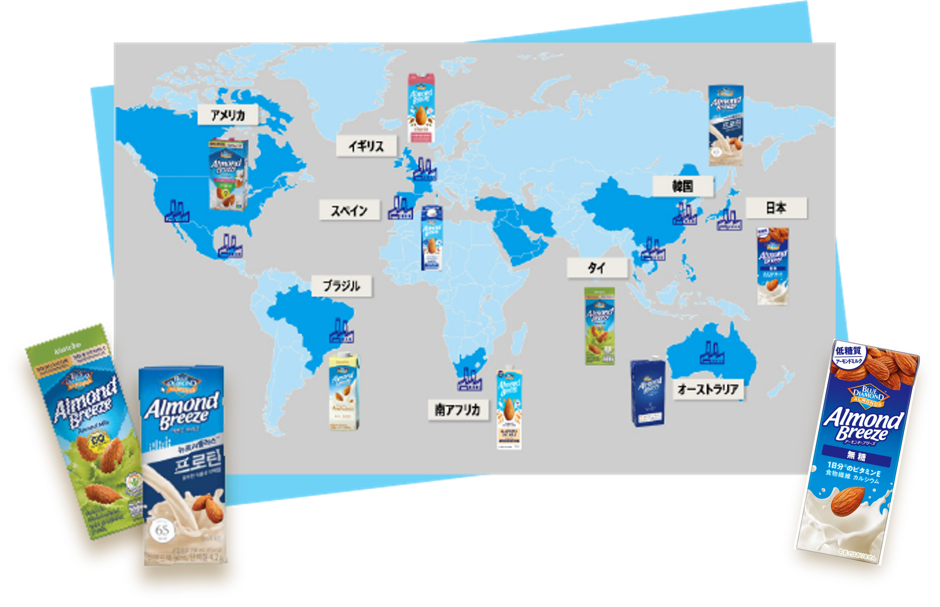 一方で、世界という視点で見るとアーモンドミルクの市場規模は非常に大きい。欧米ではすでにアーモンドミルクはスタンダードな飲料となっている。全米売上№1※を獲得し、アメリカの多くの家庭で飲まれているのが、カリフォルニア発のブランド「アーモンド・ブリーズ」だという。