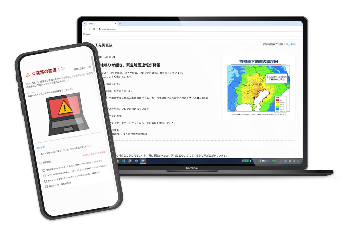 膨大な事例データを搭載した「dan-lo」では、首都直下地震、南海トラフ地震、サイバー攻撃、武力攻撃など、様々な訓練シナリオを作成できます。AI機能を活用することで、より実践的な内容の訓練が可能。さらに専門コンサルタント監修の最新事例やトレンドをふまえたシナリオも用意されており、社員の危機意識を高めるリアルさを追求しています。