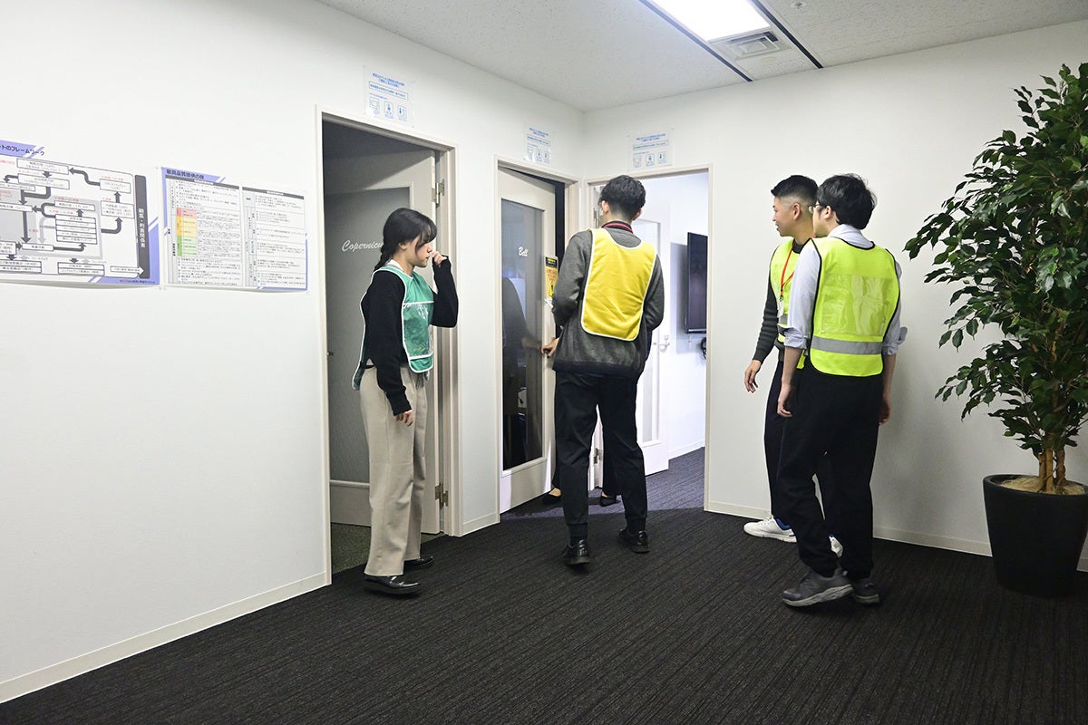 災害時における初動対応の社内訓練風景、閉じ込められ者と危険個所の確認