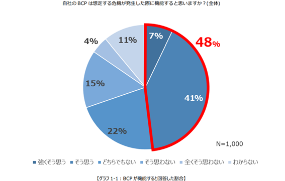 当社調査によると自組織の BCP が機能すると回答した割合は半数以下にとどまる。