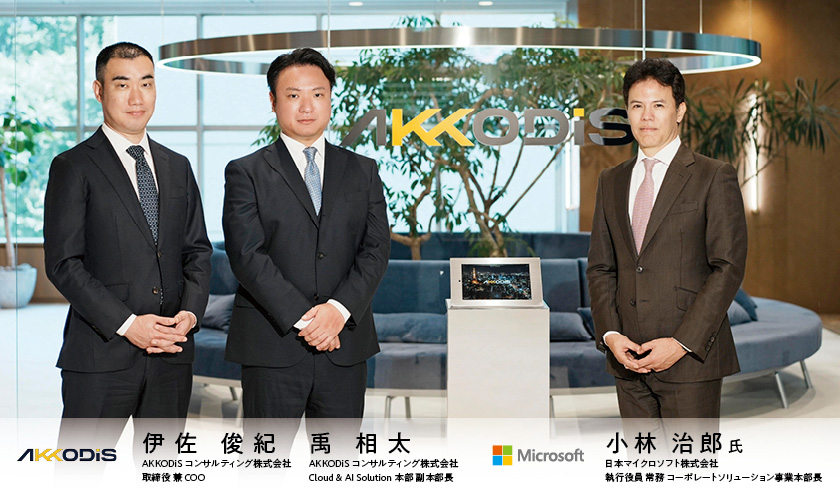 そうしたなか、AKKODiSコンサルティングは2024年よりMicrosoft 365 Copilot(以下、M365 Copilot) とMicrosoft Power Platformを活用したDX戦略プログラムを社内で展開。トップダウンでの改革ではなく、現場自らがAIを活用してトランスフォーメーションしていくという180度転換したマインドチェンジにより、成果を上げています。こうした実績を踏まえ、AX推進に向けていまこそ企業が取るべきアプローチについて、AKKODiSコンサルティング 取締役 兼 COOの伊佐俊紀、Cloud & AI Solution本部 副本部長の禹相太(ウ・サンテ)が、日本マイクロソフト 執行役員 常務 コーポレートソリューション事業本部長の小林治郎氏を招いて語り合いました。