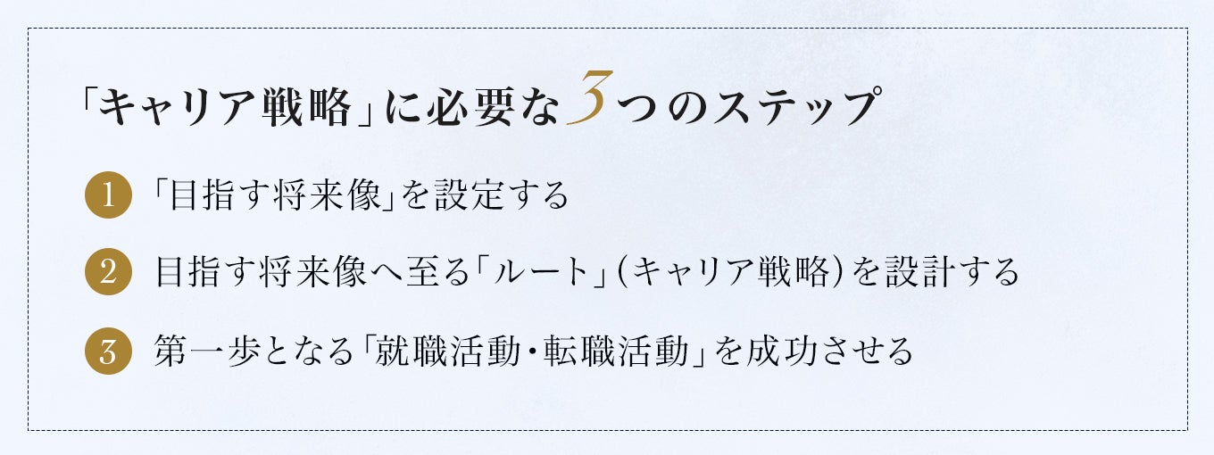 コンコードでは、豊富な知見を体系化した、独自のキャリア設計法をベースに支援をしている。その中心となるのが「キャリア戦略」だ。キャリア戦略とは、自分が望む人生を実現するために、経るべきキャリアを定めた中長期的なプランのことである。
