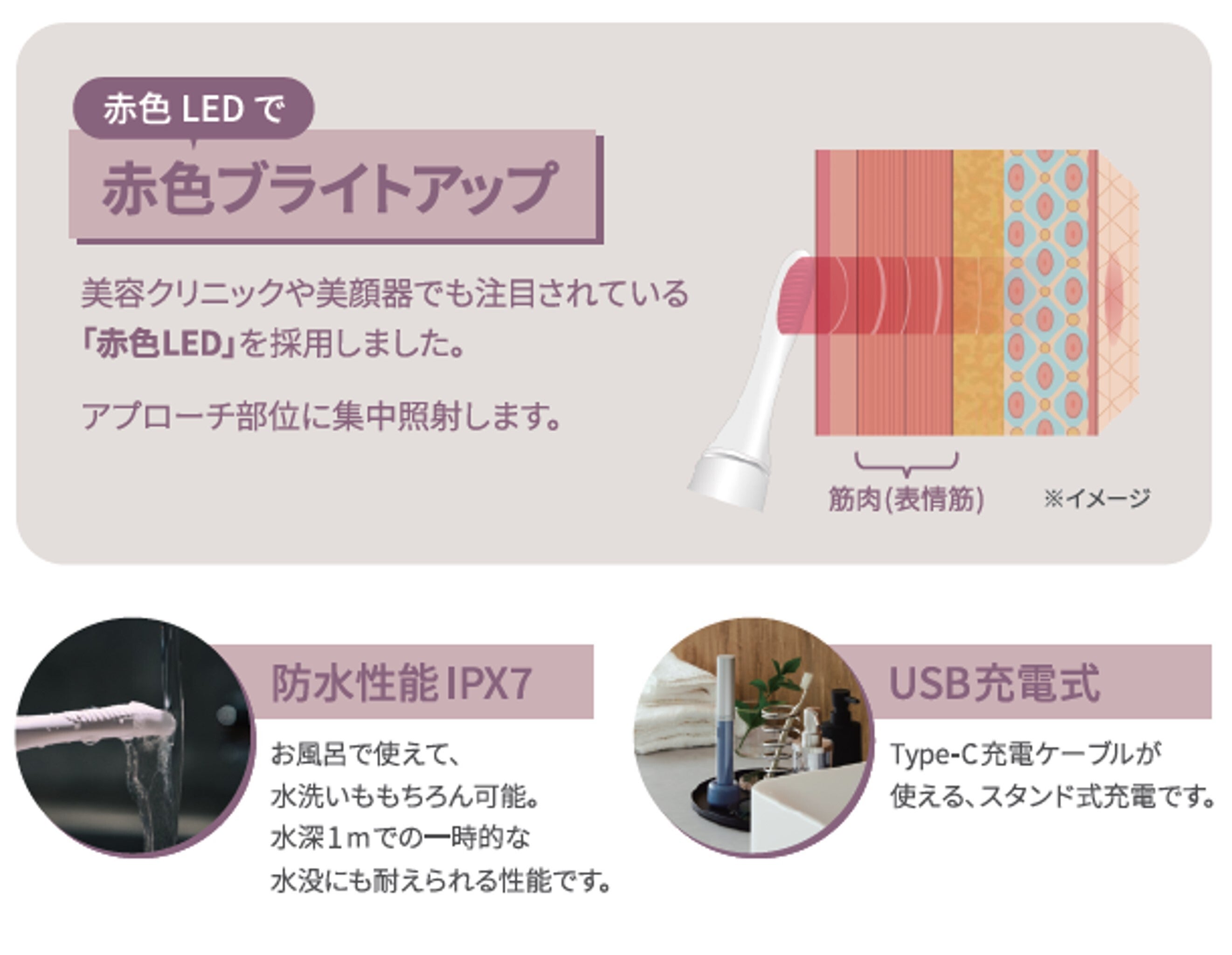 さらに、美容クリニックや美顔器で人気の赤色LEDも搭載しています。人によって見え方は異なりますが、肌の外側からも赤い光が確認でき、どこをケアしているかが一目でわかるといった特徴もあります。